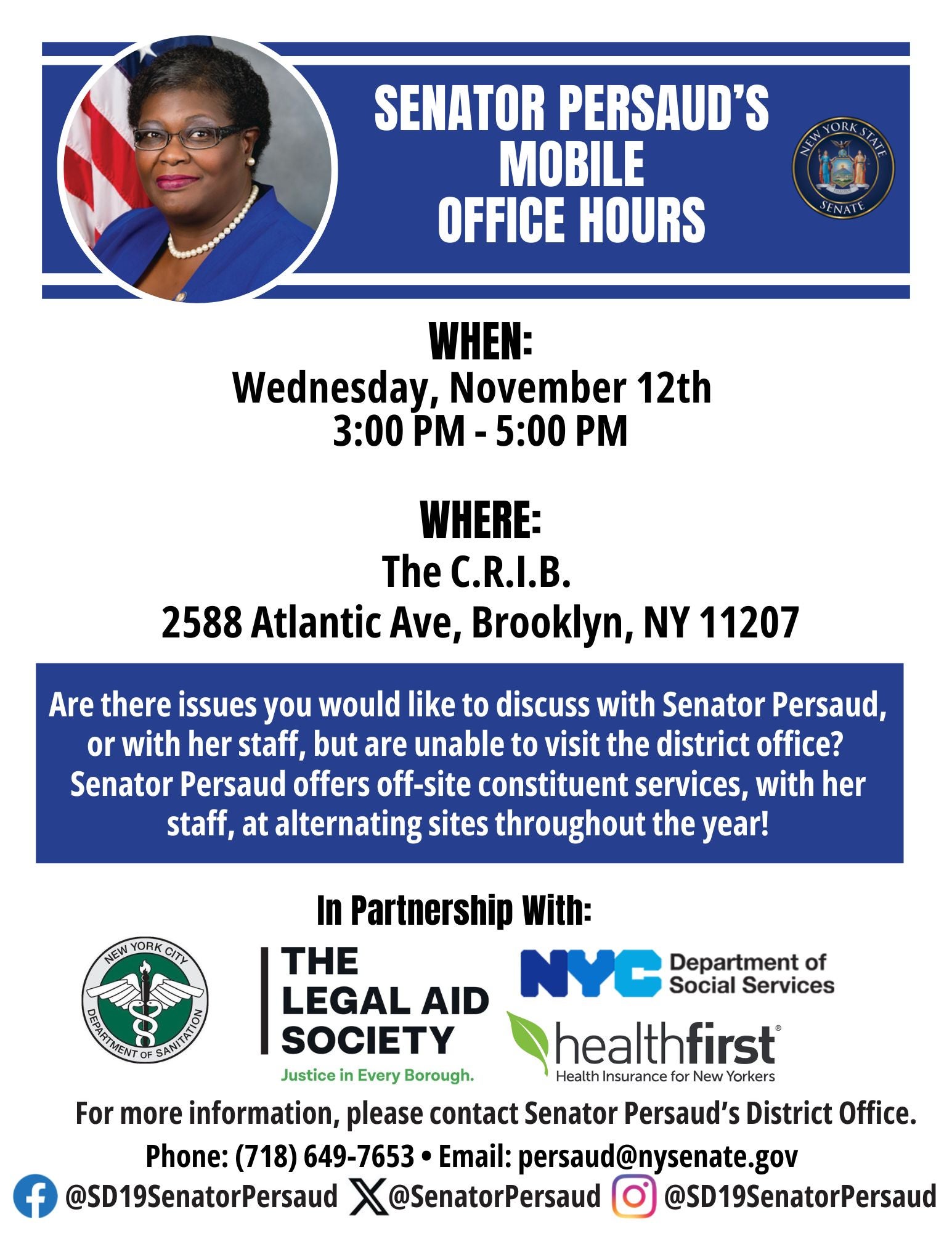 Join us on Wednesday, November 12th, from 3 PM to 5 PM for our Mobile Office at The C.R.I.B., 2588 Atlantic Avenue.