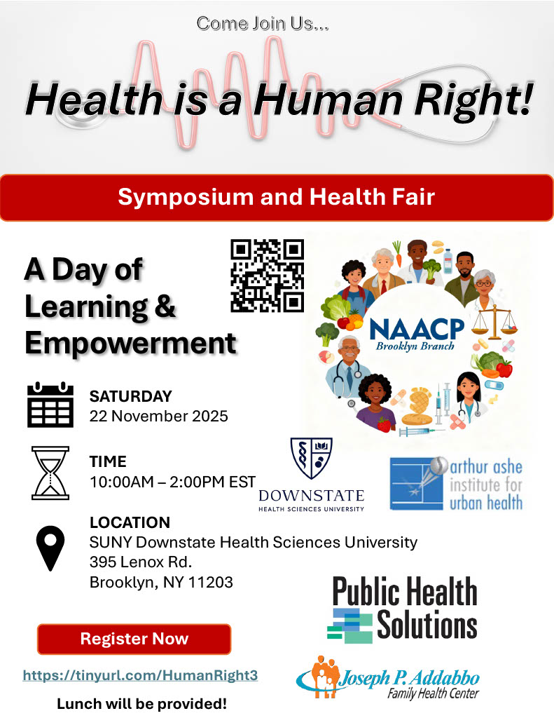 Welcome to the Health is A Human Right Series: Symposium and Health Fair! Join us at SUNY Downstate Health Sciences University for a day filled with informative sessions and interactive activities focusing on health as a fundamental human right. Our event will feature expert speakers, panel discussions, break out sessions and a health fair showcasing various resources and services. Don't miss this opportunity to learn, engage, and advocate for health equity. See you there!
