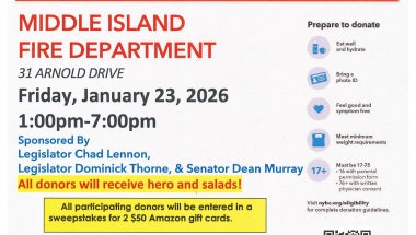 NYS Senator Dean Murray, Legislator Chad Lennon, and Legislator Dominick Thorne are sponsoring a Blood Drive this month. This will be taking place at Middle Island Fire Department – 31 Arnold Drive – Middle Island, starting at 1pm and ending at 7pm. The New York Blood Center has issued a Blood Emergency and are in need of blood donations following the holidays. Come on down and give the gift of life.