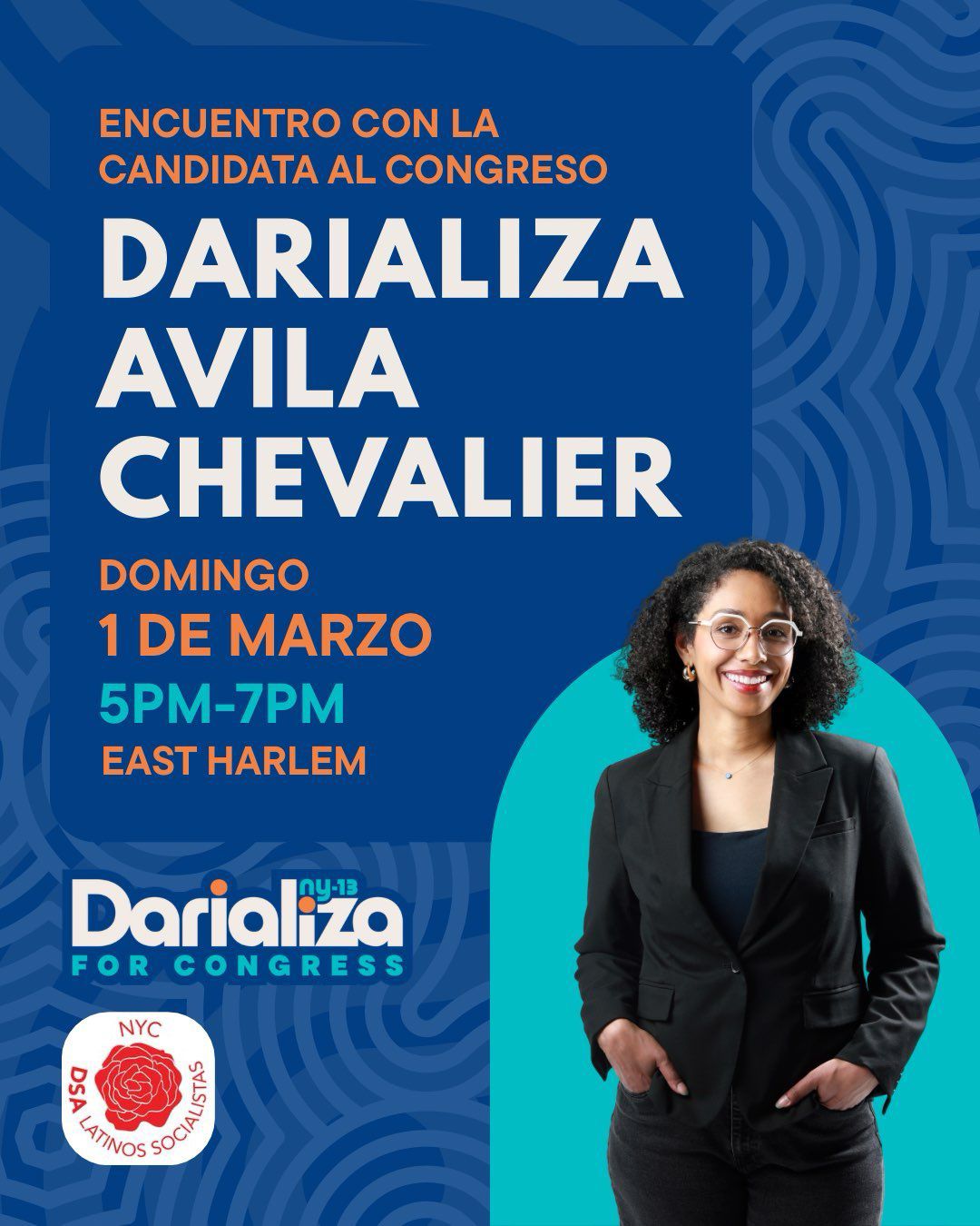 ¿Vives en el distrito congresional 13? ¿Sabes quiénes son los candidatos al congreso este año? Te invitamos a asistir al evento organizado por DSA Latinos Socialistas con nuestra compañera y miembro de DSA, Darializa Avila Chevalier. El evento sera mayormente bilingüe, en ambos español, ingles y un poco de spanglish.
